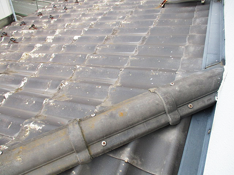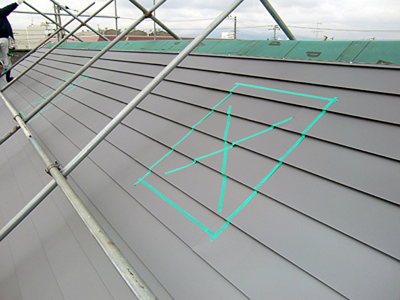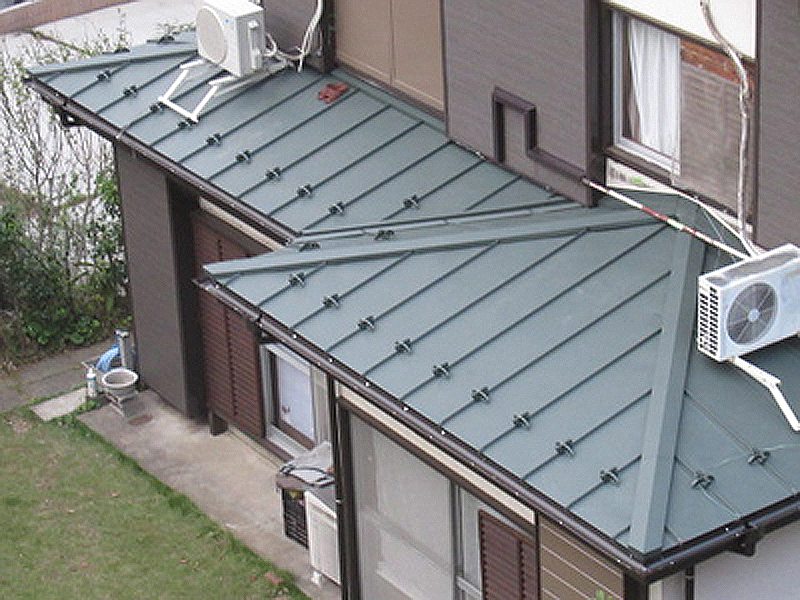 2種類の旧屋根材を、稲垣商事(株)スタンビーTL-455とニチハ(株)製の横暖ルーフSにて、葺き替えました。塗膜はメーカーの20年保証があります。